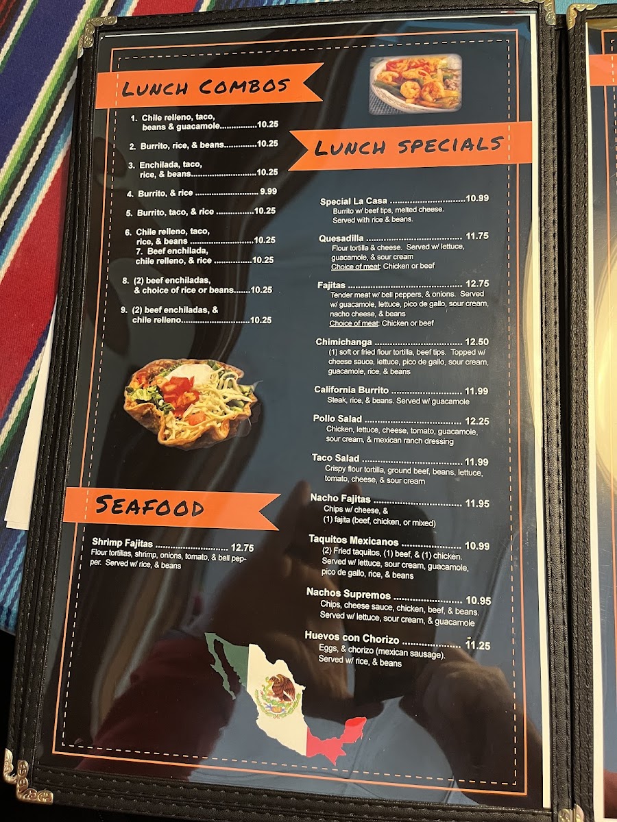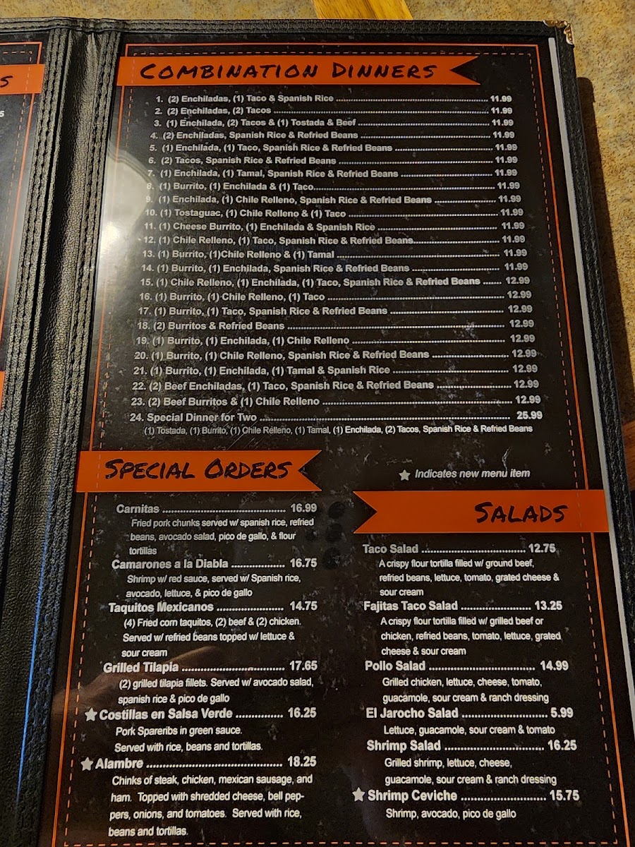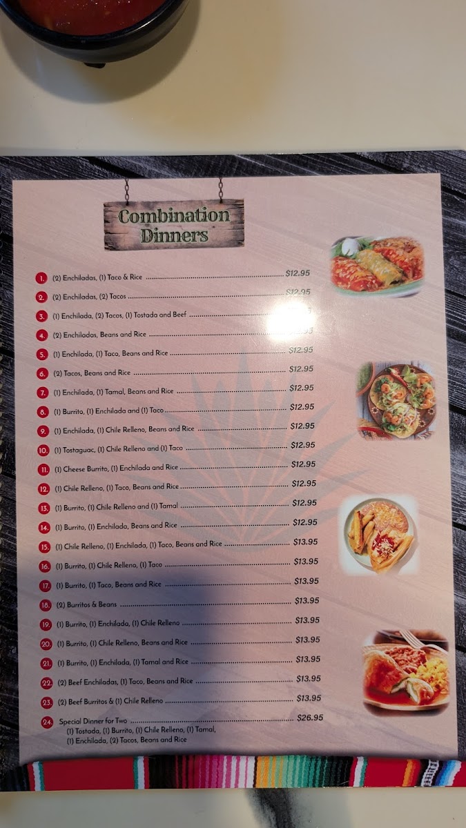 (1) Tostada, (1) Burrito, (1) Chile Relleno, (1) Tamal, (1) Enchilada, (2) Tacos, Spanish Rice & Refried Beans