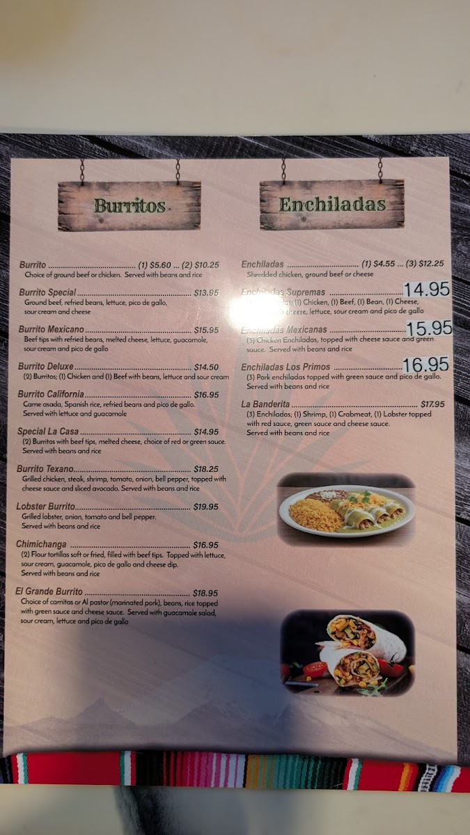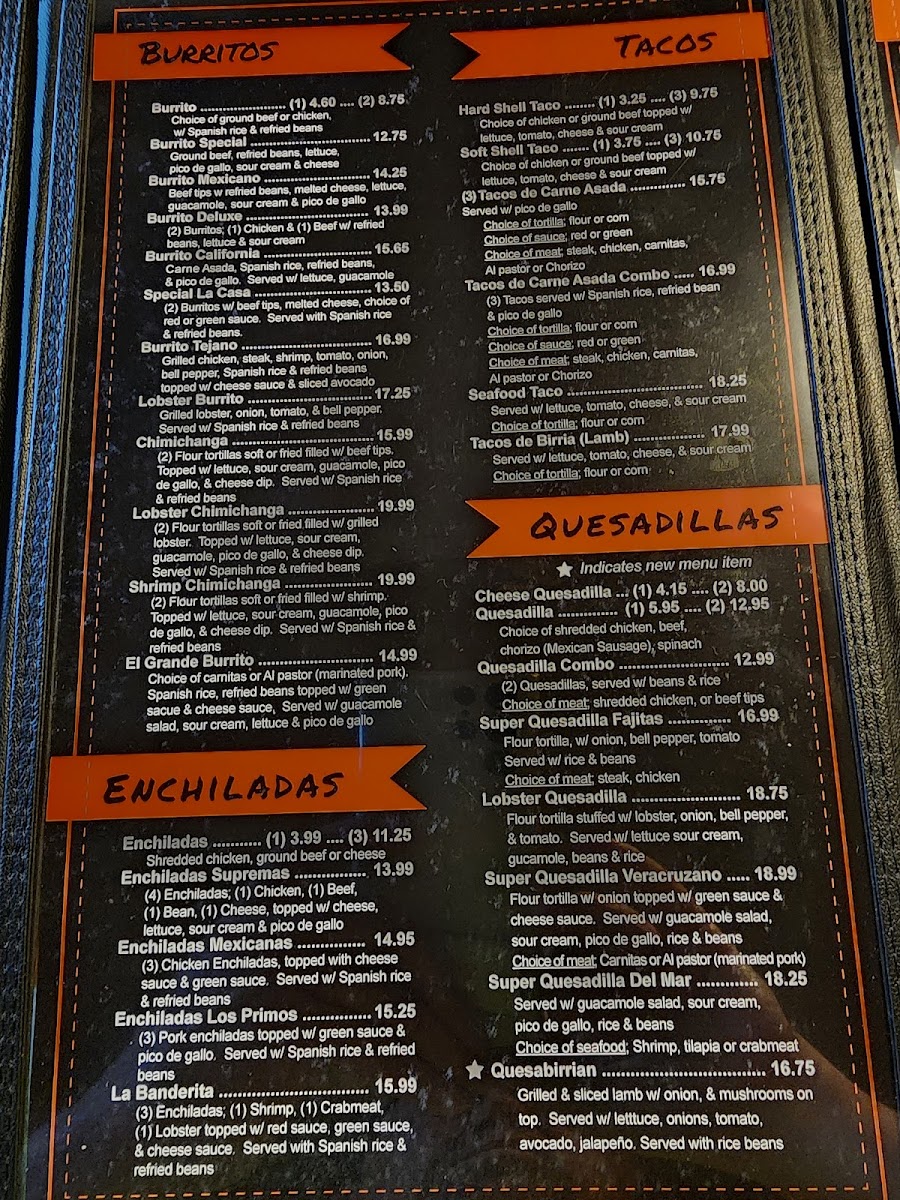(3) Enchiladas; (1) Shrimp, (1) Crabmeat, (1) Lobster topped w/ red sauce, green sauce, & cheese sauce. Served with Spanish rice & refried beans