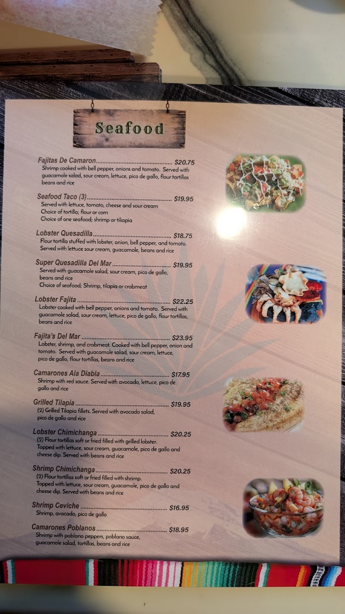 Served w/ guacamole salad, sour cream, pico de gallo, rice & beans Choice of seafood; Shrimp, tilapia or crabmeat